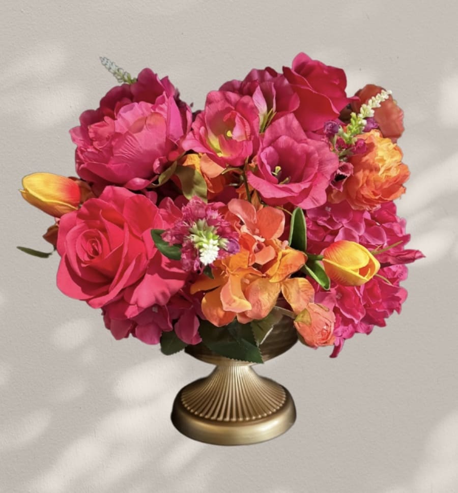 The ‘Kate’ centerpiece offers a high impact low cost option for your wedding decor. Bursting with hot pink and orange faux flowers, this low classic style centerpiece is perfect for weddings, budget wedding plans and diy wedding setups that need high-impact decor without the cost or upkeep. Wedding decor hire centerpiece in Buckinghamshire, Northamptonshire, Oxfordshire, Cotswolds, Bedfordshire.