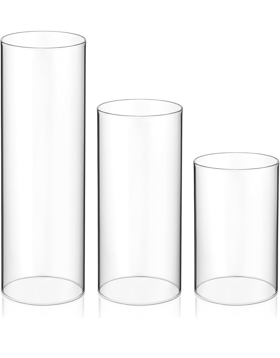 Three glass cylinder vases. Simple. Elegant. Versatile. The Trio of vases in Buckinghamshire is a set of small, medium and large glass cylinders designed for striking centerpieces, aisle markers, staircases and fireplace displays. Fifteen sets available. Candles not included. Perfect for weddings, events and parties.