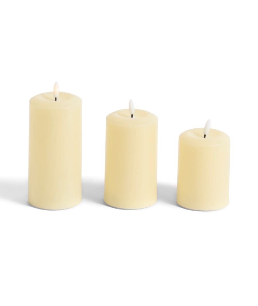 Place the Trio of LED candles at staggered heights inside cylinder vases for a dramatic column effect. Use them on reception tables as part of a centrepiece cluster. Add greenery or mirrored plates beneath to amplify the glow. For aisles or entryways, space the trio evenly to create a guiding path of soft light.