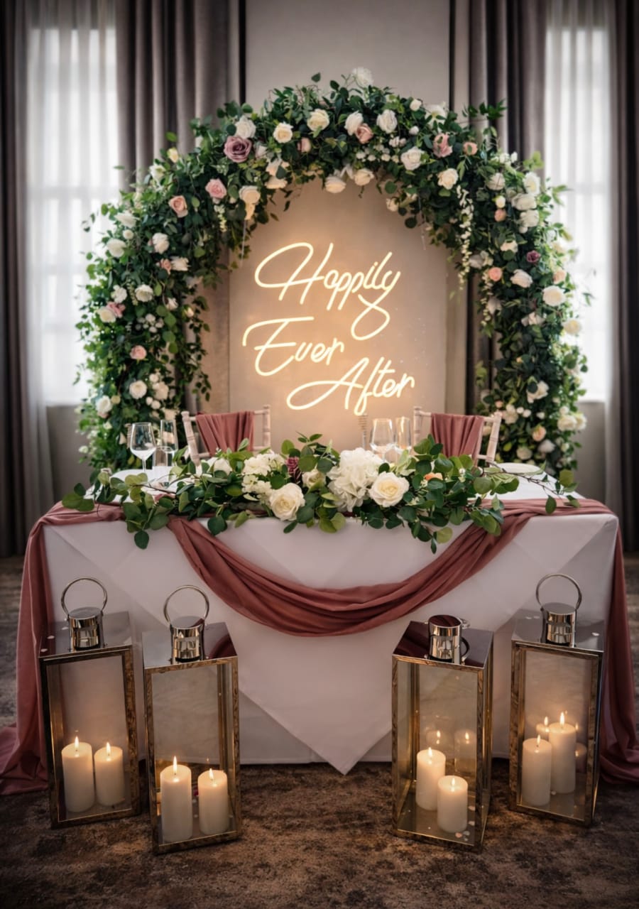 Create a romantic focal point with our Sweetheart table decor. Designed for wedding receptions, this curated collection combines an arch, neon sign options / flower wall, candles, floral garlands, drapes and lanterns to frame the couple. Perfect for photos, vows and intimate toasts, Sweetheart table decor in Buckinghamshire, Northamptonshire, Oxfordshire, the Cotswolds, Hertfordshire and Bedfordshire elevates your reception with cohesive styling and timeless atmosphere.